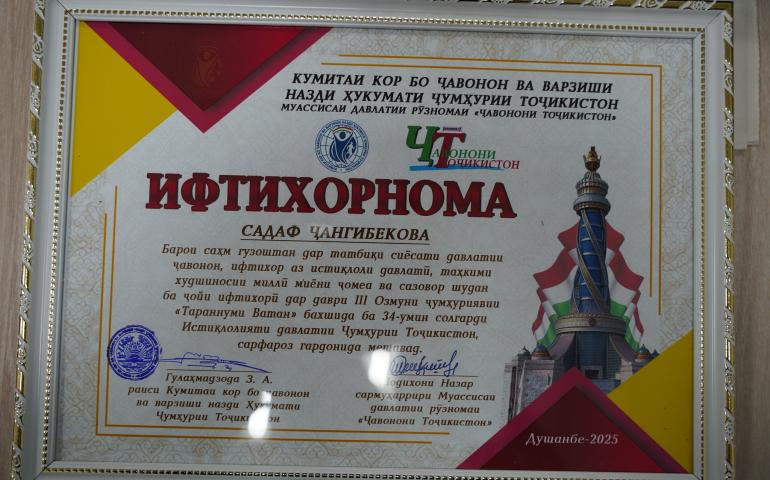 Дар ин Озмун корманди Иниститути фалсафа, сиёсатшиносӣ ва ҳуқуқи ба номи А. Баҳоваддинови АМИТ бонуи зираку ҳушёр Садаф Ҷангибекова иштирок карда, дар ҷамъбастии Озмуни мазкур Садаф Ҷангибекова сазовори мақоми “Даҳгонаи беҳтарин”-ро касб намуд.