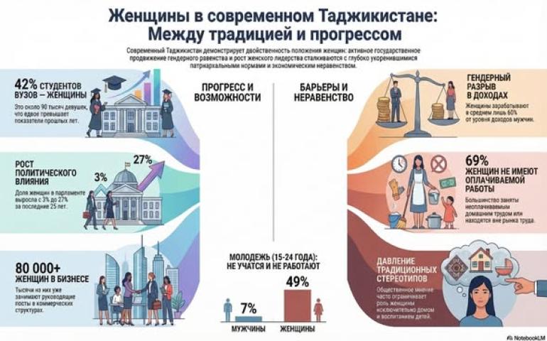 Положение женщины в Таджикистане имеет глубокие корни и претерпевает сложную эволюцию от традиционных патриархальных норм к современному включению в общественную жизнь. Во времена Советского Союза государственная идеология сделала ставку на «женскую эмансипацию» и борьбу с феодально-религиозными практиками. Так, советские идеологи запрещали многоженство и рассматривали его «как институт, унижающий достоинство советской гражданки и нарушающий её права». Проводились кампании грамотности и вовлечения женщин в образование и труд, преодолевались вековые устои о том, что место женщины исключительно в доме. После обретения независимости эти достижения оказались под угрозой: во время гражданской войны (1992-1997) и последующего религиозного возрождения в обществе вернулись традиционные обычаи, вновь усилились консервативные представления о женских ролях. В то же время независимость открыла новые возможности: уже в 1997 году была введена президентская квота для девушек из отдалённых районов при поступлении в вузы, что расширило доступ женщин к высшему образованию. Кроме того, Таджикистан одним из первых в регионе ратифицировал важнейшие международные конвенции, в том числе Конвенцию по ликвидации дискриминации в отношении женщин (CEDAW).