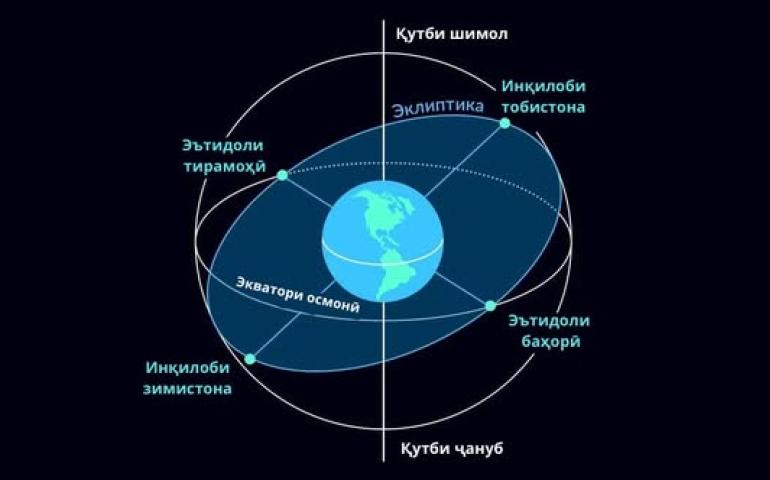 Ҳамин тариқ, Замин дар атрофи Офтоб як маротиба тоб хӯрда аз ду нуқта мегузарад, ки дар онҳо давомнокии рӯз зиёдтарин ва камтарин мебошад, ки он нуқтаҳоро инқилоби тобистона (20-21 июн) ва зимистона (21-22 декабр) меноманд. Ҳамчунин аз ду нақта мегузарад, ки дар онҳо шабу рӯз баробаранд, ки нуқтаҳои эътидоли баҳорӣ (20-21 март) ва тирамоҳӣ (22-23 сентябр) номида мешаванд.