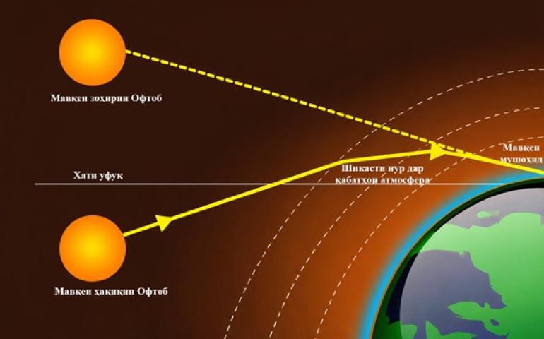 Атмосфераи Замин мисли линза амал мекунад: зичии ҳаво, ки аз қабати болоӣ бо рафти ба поён фаромадан зиёд мешавад ва нурҳои Офтоб ҳангоми гузаштан тадриҷан каҷ мегарданд. Аз ҳамин сабаб мо метавонем Офтобро ҳатто дар он ҳолат бинем, ки ба таври геометрӣ он ҳанӯз каме поёнтар аз уфуқ қарор дорад, ки онро Офтоби зоҳирӣ меноманд.